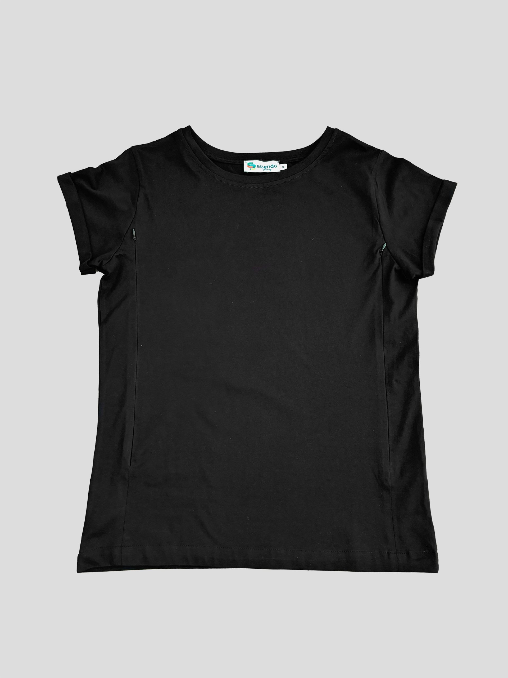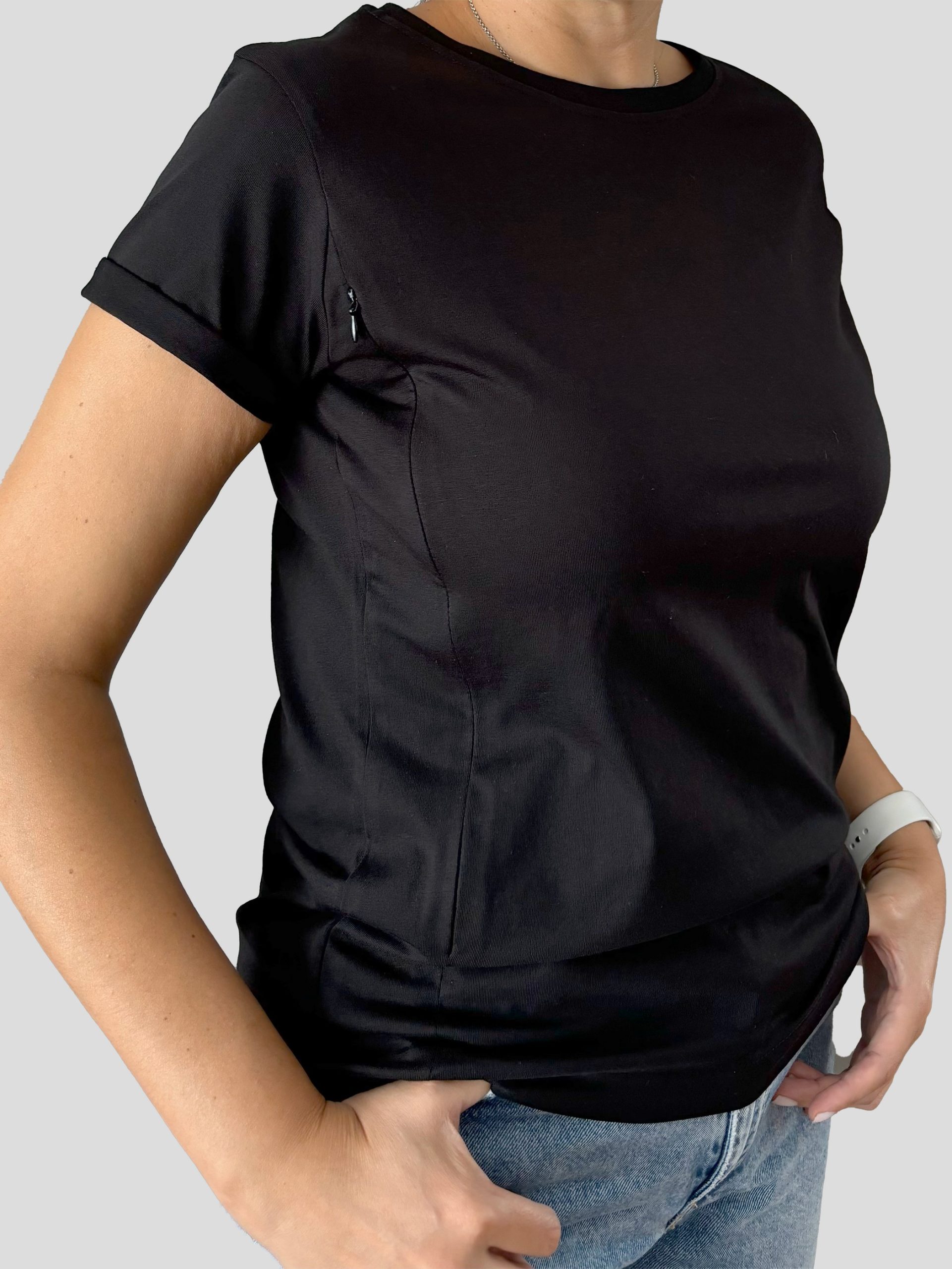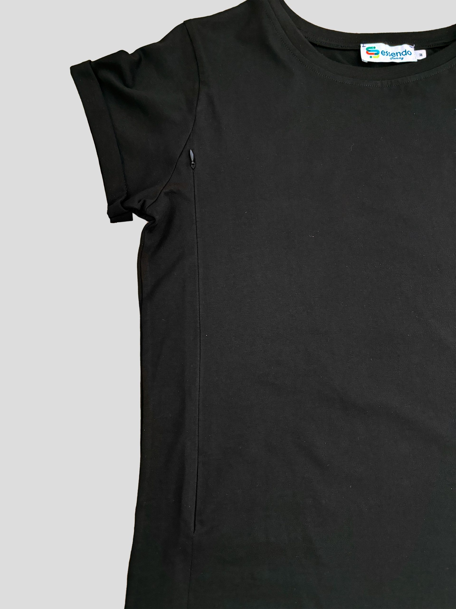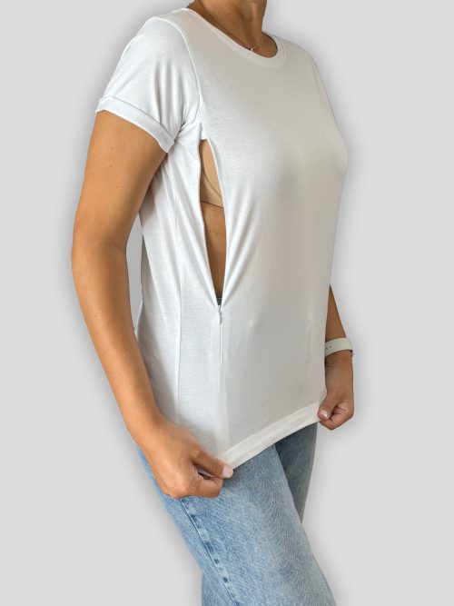 Essendo emzirme tişörtlerimiz benzersiz bir tasarıma sahiptir, emzirme için kolay erişim sağlamak amacıyla her tişörtün iki yanında gizli bir fermuar bulunur.